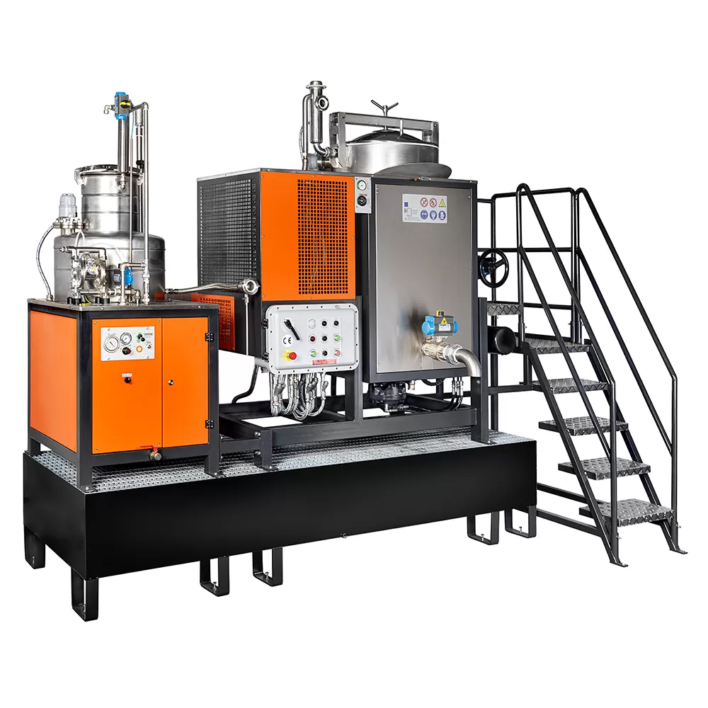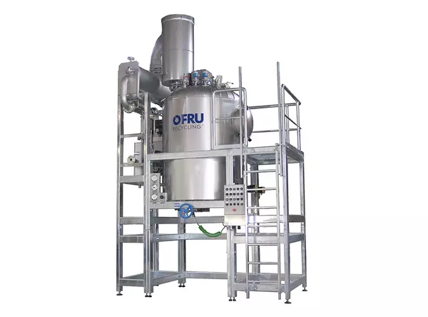 OFRU ASC-3000 — промышленный вакуумный регенератор растворителей серии ASC для непрерывной очистки больших объёмов: конический стальной котёл с паровым нагревом в двойной рубашке, автоматическая подача загрязнённой жидкости, режим дистилляции осадка, самоочищающая мешалка с ПТФЭ-скребками и управление PLC SIEMENS для работы 24/7.