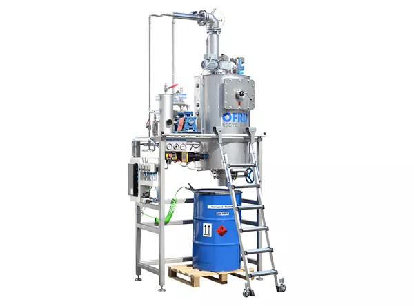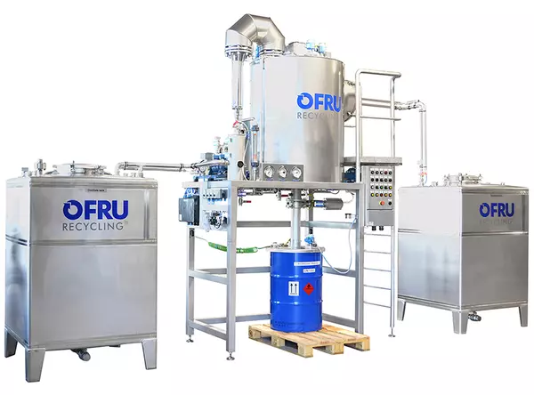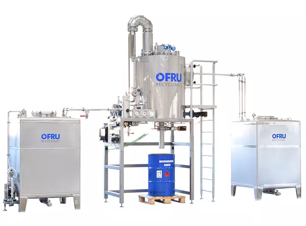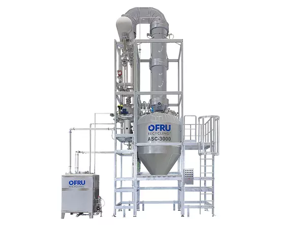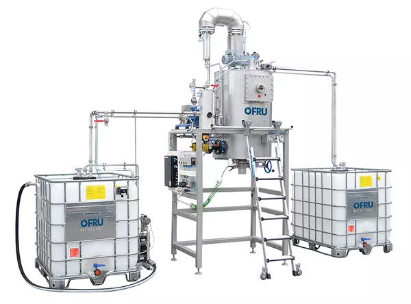 OFRU ASC-100 — профессиональная установка непрерывной регенерации загрязнённых растворителей для больших объёмов (испаритель 20–1000+ л/ч, котлы 160–6000 л) с вакуумной дистилляцией, самоочищающимся коническим бесшовным котлом, современными системами нагрева и управлением SIEMENS через цветной сенсорный дисплей для работы в 1–3 смены.